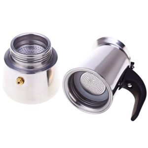 Détails Produit Caractéristiques: Cafetière en inox Capacité : 4 tasses* (environ 50ml/ tasse) Poignée en backelite noir Tous feux sauf induction *La notion ‘nombre de tasses’