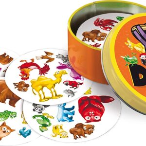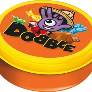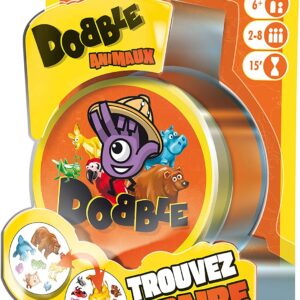 DOBBLE Animaux – Dobble c’est une série de mini-jeux rapides où tous les joueurs jouent en même temps. 1 consigne simple : repérez plus vite que vos adversaires le seul et unique symbole identique entre deux cartes ! Dobble, le succès du jeu de réflexes et d’observation, s’allie au thème animalier, pour le plaisir des jeunes joueurs et de tous les autres ! – Une boîte et cinq jeux différents dedans