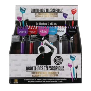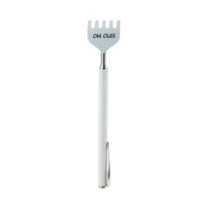 Amusez-vous avec ce gratte-dos télescopique! Au bureau comme à la maison vous pourrez vous détendre en le déployant de 17 à 52 cm pour atteindre les zones du corps qui restent inaccessibles. Vous serez également séduit par le message amusant illustré au niveau du râteau. Composition : Inox.