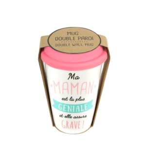 Offrez ce mug de transport à votre maman et laissez-la être agréablement surprise par son message. Il ne tardera pas à devenir son compagnon de route préféré ! Petit bonus : le mug est à double paroi pour protéger de toute brûlure. Dimensions : 9.8×9.8×15 cm – Composition : Porcelaine et couvercle en silicone – Message : Ma maman est la plus géniale et elle assure grave !