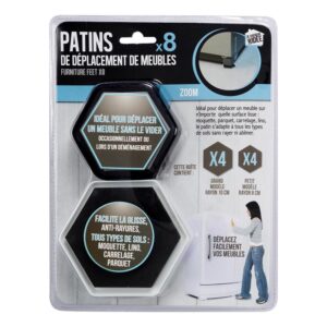 Déplacez facilement vos meubles sans les vider occasionnellement ou lors d’un déménagement en protégeant vos sols grâce à ce lot de 8 patins. Fixez-les en toute simplicité sur n’importe quelle surface lisse, il ne vous restera plus qu’à pousser! Détail : Format hexagonal.