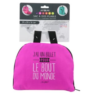 Ce sac à dos ingénieux se plie et se range dans sa pochette pour vous offrir un encombrement minimal sous forme de sacoche! Il sera ultra pratique lors de vos déplacements. Détail : Fermetures principales à glissière – Dimensions anses incluses : 28x16x39 cm.